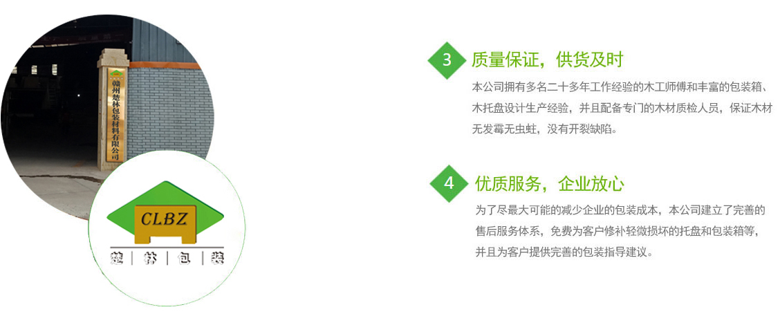 贛州楚林包裝材料有限公司創立于2008年,是一家集專業設計、生產和銷售為一體的實體型企業,主要生產木箱、包裝箱、熏蒸托盤、鋼帶箱、鋼帶壓邊箱、圍板、木籠、木支架、線纜軸盤,以及各種免熏蒸包裝箱、托盤、棧板、卡板和實木家具等。本工廠(前身為南康區新世紀家具廠)具有十幾年的木質品包裝產品生產經驗,特別是對重型機械或產品具有豐富的設計和包裝經驗,保證客戶產品完好無損到達目的地。十幾年來,本工廠已為贛州地區多家知名實力企業提供了優質、安全、可靠的包裝代理服務,產品廣泛應用到金屬新材料、稀土、電路板、新能源電池、電氣設備和數控化智能設備等行業。我廠同時可根據客戶的產品來樣和設計圖紙要求進行制作,不同的國...